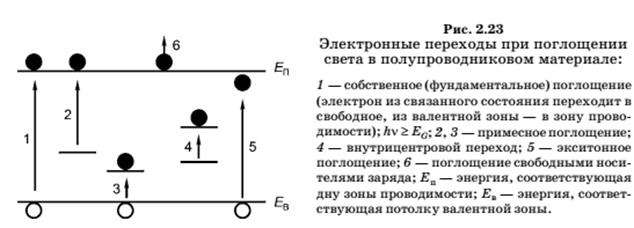 В полупроводниках различают пять основных видов поглощения излучения: собственное, примесное, экситонное, решеточное, на свободных носителях. Собственное (фундаментальное) поглощение определяется межзонными переходами электронов из валентной зоны в свободную и сопровождается генерацией электронно-дырочных пар. В зависимости от энергетического расстояния между зонами такое поглощение наблюдается в широкой области спектра, включая видимую, инфракрасную и ультрафиолетовую. Собственное поглощение — типично пороговый процесс, поскольку минимальная энергия поглощаемых фотонов определяется шириной запрещенной зоны полупроводника. Область вблизи h≈EG называется краем собственного поглощения. При hν < EG коэффициент собственного поглощения равен нулю и излучение проходит через полупроводник без потерь. Вид спектральных зависимостей коэффициентов поглощения различных полупроводников определяется структурой их энергетических зон. Для прямозонных полупроводников собственное поглощение для прямозонных полупроводников резко возрастает даже при малых превышениях энергии поглощаемых фотонов относительно EG. Для непрямозонных полупроводников (Si, Ge, GaP и др.) переброс электрона в зону проводимости сопровождается изменением его квазиимпульса и требует участия в процессе поглощения третьего тела, например фонона. Примесноепоглощение связано с процессами ионизации или возбуждения примесных уровней, лежащих в запрещенной зонs полупроводника. При этом под действием фотонов соответствующей энергии возможны переходы электронов с примесного уровня в зону проводимости, из валентной зоны на примесные уровни (фотоионизация мелких уровней) или с одного примесного уровня на другой (фотоионизация и фотонейтрализация глубоких уровней). Экситонное поглощение характерно для полупроводников с достаточно широкой запрещенной зоной. Экситон — слабосвязанная пара «электрон–дырка», имеющая серию энергетических уровней. Это нейтральное образование. Его появление не приводит к изменению электрических характеристик образца. Если температура достаточно высока, то под действием тепловой энергии электрон переходит в зону проводимости, т. е. в этом случае получается результат, достигаемый при собственном поглощении света. При этом фотопроводимость не меняется. Решеточное поглощение происходит при взаимодействии поля световой волны с колеблющимися зарядами узлов решетки. Другими словами, при решеточном поглощении фотона рождается фонон, причем этот процесс не сопровождается фотогенерацией свободных носителей заряда. Таким образом, в результате поглощения излучения в полупроводнике возникают свободные носители заряда или изменяется концентрация этих носителей. Это явление носит название «внутренний фотоэффект» (ОТВЕТ НА 61 ВОПРОС) и характеризуется безразмерной величиной — квантовым выходом η, равным отношению числа генерируемых фотоносителей к числу поглощаемых полупроводником фотонов. При hν < EG, η= 0, а при hν > EG η резко увеличивается и становится близким к единице, практически не меняясь при дальнейшем увеличении энергии фотонов. Избыточная энергия
