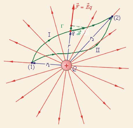 Итак, работа сил электростатического поля по перемещению точечного заряда из положения 1 в положение 2 по контуру Г может быть вычислена по формуле: