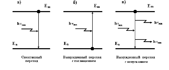 А. Эйнштейн в теории о вынужденном излучении (испускании) внес неоценимый вклад. Его гипотеза состоит в том, что под действием электромагнитного поля частоты ω молекула (атом) может: