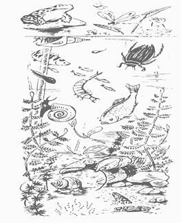 Видовое разнообразие биоценозов. Каждый живой организм живет в окружении множества других, вступая с ними в самые разнообразные отношения, как с положительными, так и с отрицательными для себя последствиями. Связь с другими организмами обеспечивает питание и размножение, возможность защиты, смягчает неблагоприятные условия среды. В то же время биотическое окружение — это и опасность ущерба или гибели. Население пресноводного водоемах, прудах, мелких озерах солнечный свет проникает до дна, создавая условия для развития водорослей и высших водных растений. В толще воды обитают многочисленные одноклеточные водоросли, нитевидные, многоклеточные водоросли. На поверхности воды в летнее время встречаются скопления тины — это тоже водоросли. На дне некоторые мхи образуют обширные темно-зеленые скопления. Вблизи берегов растет водяной хвощ, на поверхности воды можно встретить водяной папоротник — сальвинию. Обильно представлены цветковые растения: камыш, тростник, рогоз, обитающие у берегов. На поверхности воды плавают листья и цветки белой кувшинки или желтой кубышки. Нередко вся поверхность прудов покрыта мелкими пластинками ряски. Часто можно встретить и многие другие водные растения, например пузырчатку, роголистник.