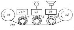 Магнитная лента МЛ перематывается с одной катушки K1 на другую K2 лентопротяжным механизмом с постоянной скоростью. Первая головка на пути ленты - стирающая ГС. В режиме записи на ее обмотку от генератора стирания и подмагничивания ГСП поступает переменный ток частотой 25-80 кГц. При этой магнитная лента попадает в довольно сильное магнитное поле стирающей головки ГС и существующая на ней запись разрушается, а лента размагничивается.