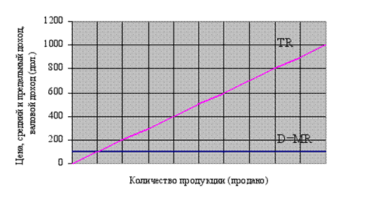 При чистой конкуренции любая единица продукции продается по одной и той же цене. Поэтому цена совпадает со средним и предельным доходом. Общий доход растет прямо пропорционально количеству проданных товаров.