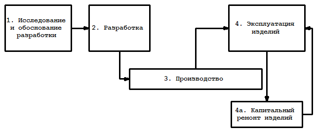 На следующем рисунке приведена типовая схема жизненного цикла изделий, распределение видов работ по стадиям жизненного цикла.
