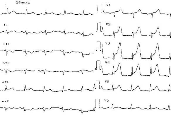 Рис. 1. Острейшая фаза трансмурального переднего инфаркта миокарда.
