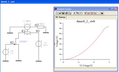 Здесь функция – ток стока. Аргументом является управляющее напряжение UЗИ , которое меняется в источнике V2 пределах -2В…+0.6В, и параметром – напряжение между истоком и стоком UИС в интервале 0…12В с шагом 0.5В (источник V1). Из графиков следует, что влиянием напряжения UИС можно пренебречь, если UИС>3В. Такой же вывод следует из семейства выходных характеристик на рис. 8.5. На переходной характеристике есть линейный участок, на котором связь приращений тока и напряжения может быть выражена крутизной S=dIc/dUзи (мА/В).