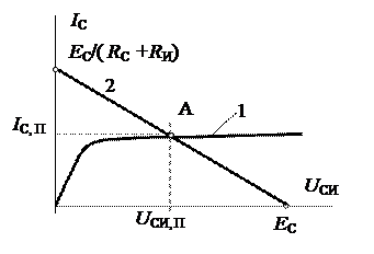 UCИ,П(IC,UЗИ,П) = EC –(RC+ RИ) IC. Это нелинейное уравнение решается графически на рис.8.11. пересечением выходной характеристики 1 и линии нагрузки 2, которая отсекает на осях отрезки EC и EC/(RC+ RИ)