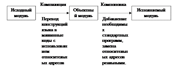 Объектный модуль – промежуточная программа, в которой конструкции исходного модуля переведены в машинные коды, но вместо реальных адресов данных и работающих с нею подпрограмм используются относительные адреса и не добавлены подпрограммы, необходимые для её работы.