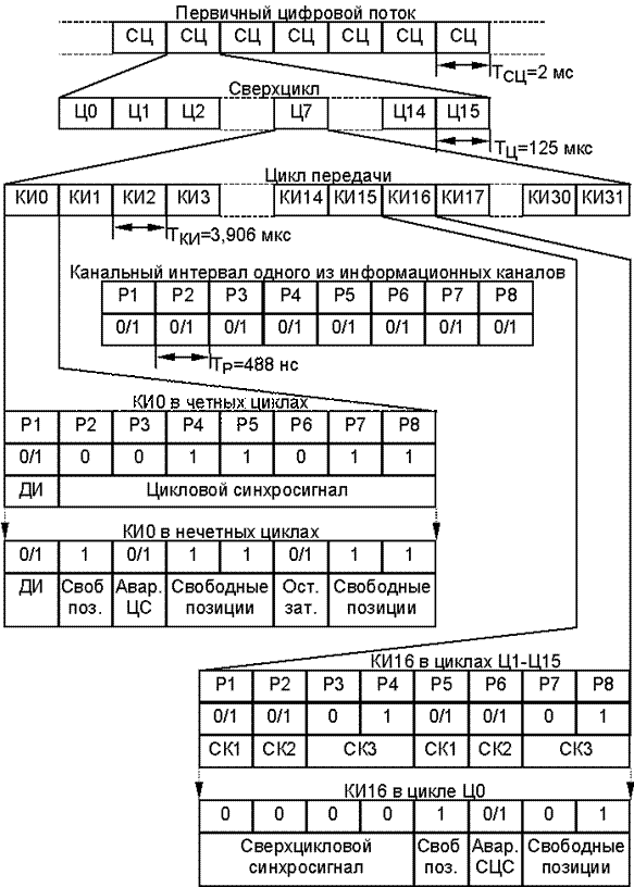 Канальные интервалы КИ1-КИ15, КИ17-КИ31 отведены под передачу информационных сигналов. КИ0 и КИ16 - под передачу служебной информации. Интервалы КИ0 в четных циклах предназначаются для передачи циклового синхросигнала (ЦСС), имеющего вид 0011011 и занимающего интервалы Р2 - Р8. В интервале Р1 всех циклов передается информация постоянно действующего канала передачи данных (ДИ). В нечетных циклах интервалы P3 и Р6 КИ0 используются для передачи информации о потере цикловой синхронизации (Авар. ЦС) и снижении остаточного затухания каналов до значения, при котором в них может возникнуть самовозбуждение (Ост. зат). Интервалы Р4, Р5, Р7 и Р8 являются свободными, их занимают единичными сигналами для улучшения работы выделителей тактовой частоты.