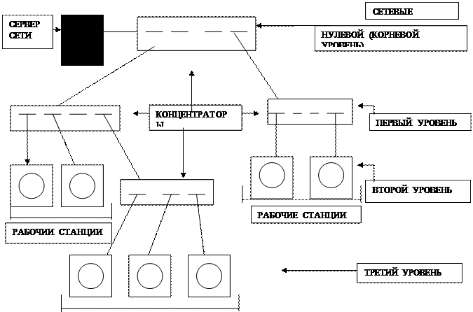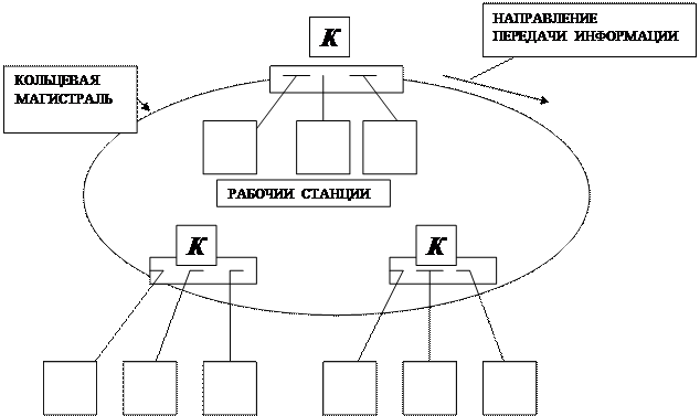 Внутренняя логическая организация концентратора может иметь шинную или кольцевую структуру.