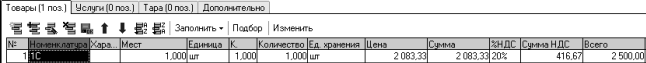 Рис. 3.20. Заполнения закладки "Товары" документа "Заказ поставщику"