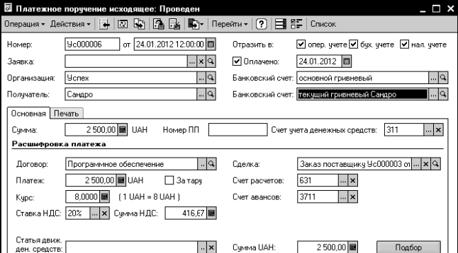 Согласно с предыдущим документом оформить поручение в банк перевести со счета организации необходимую сумму на счет поставщика ВАТ "Сандро" (рис. 3.21).