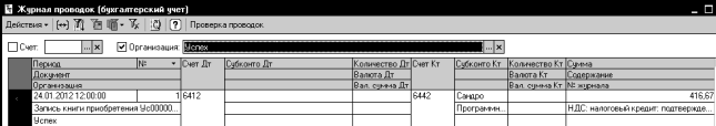 Рис. 3.27. Проводка в "Журнале проводок (налоговый учет)"