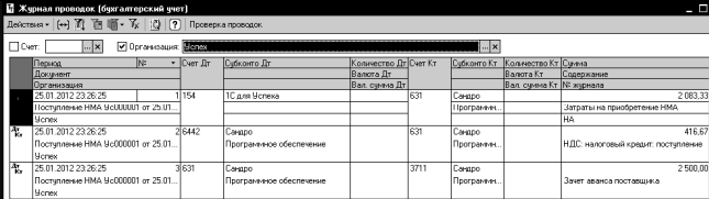 Рис. 3.26. Проводка в "Журнале проводок (бухгалтерский учет)"