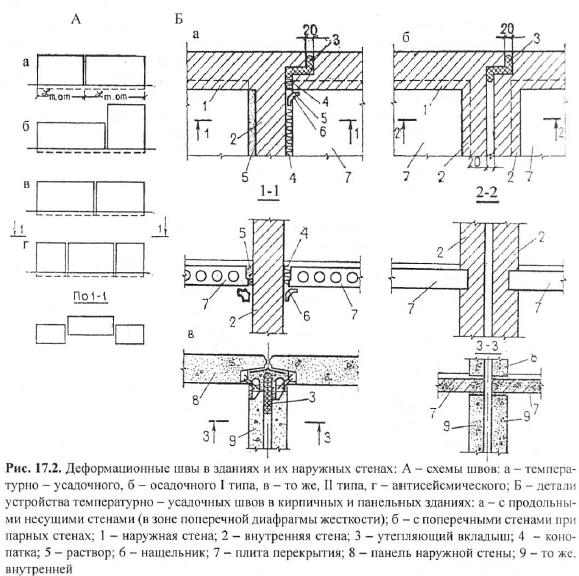 Температурно-усадочные швы устраиваются для предотвращения образования в наружных стенах здания трещин и перекосов, вызываемых концентрацией усилий от воздействия переменных температур и усадки материала (каменной кладки, монолитных и сборных бетонных конструкций и др). Температурно-усадочные швы рассекают конструкции только наземной части здания. Расстояние между этими швами назначают в соответствии с климатическими условиями и физико-механическими свойствами стеновых материалов.
