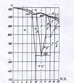 Алюминиевые бронзы, как и оловянистые, бывают однофазные и двухфазные. Предельная растворимость алюминия в меди составляет 9,8% (рис.5).