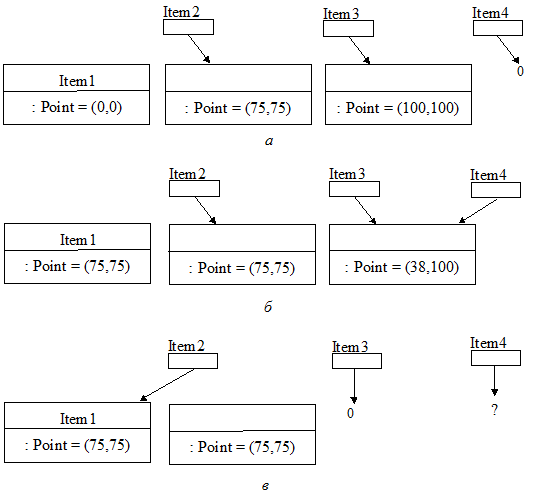 Объект Item1 и объект, на который указывает Item2, теперь относятся к одной и той же точке экрана. Указатель Item4 стал указывать на тот же объект, что и Item3. Хотя объект Item1 и объект, на который указывает Item2, имеют одинаковое состояние, они остаются разными объектами. Кроме того, мы изменили состояние объекта *Item3, использовав его новое косвенное имя Item4.