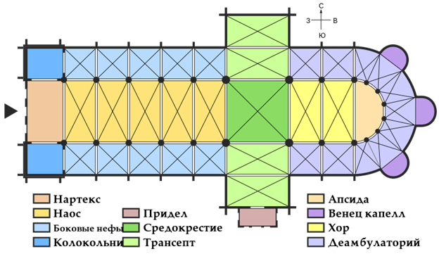 Романская базилика – 3 или 5 нефов, 1 или 2 трансепта. В некот.школах усложнена вост.часть церкви: хор, завершаемый выступом абсиды, окружённый «венком капелл» (радиально расходящиеся капеллы). В нек.странах, чаще во Франции, разрабатывается хор с обходом (для паломников): боковые нефы как бы продолжаются за трансептом и огибают алтарную абсиду.
