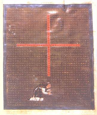 Целая серия миниатюр наподобие загадочных ребусов-таблиц. Вся поверхность миниатюры состоит из букв, на которые наслаиваются другие изображения, геометрические (гольца, кресты, орнаменты) или фигуративные (Христос, символы евангелистов). Текст может читаться ив целом, и внутри изображений, например, внутри креста – похвала святому кресту и т.д. Это нечто наподобие сложных математических формул, настолько изощренное изобретение, что кажется бесплодным. Для средневекового человека эти ребусы понимались как молитвы со славу Божию, и чем больше на них было потрачено усилий, тем они были эффективнее.