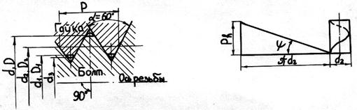 Основные параметры цилиндрической резьбы (рис.26.17): d, D– наружные диаметры соответственно болта и гайки; d1, D1;d2, D2 – внутренние и средние диаметры резьбы; d3 – внутренний диаметр болта по дну впадины; Р – шаг (расстояние между одноименными сторонами двух смежных профилей);
