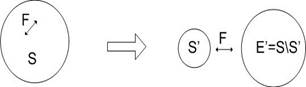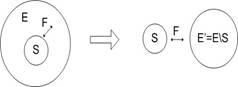Одно из фундаментальных понятий синергетики и теории бифуркаций – бифуркация. Бифуркация – приобретение нового качества системы при малых внешних воздействиях. В частности, бифуркация – приобретение нового качества системы при малых начальных изменениях внутренних и внешних сил. Среда S и система E имеют свои параметры и связаны друг с другом взаимодействием F, которое может иметь как внутренний (действует внутри системы), так и внешний (действует между системой и средой) характер. Среда, система и воздействия могут быть преобразованы из одной формы в другую и приведены в более удобную форму. На рисунке 1.4 показаны примеры такого приведения (без штрихов – прежние варианты, со штрихами – приведенные). В обоих случаях воздействие по отношению к системе стало внешним.