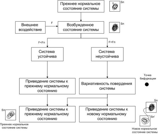 Система неустойчива, если при действии на нее сил, больших порога, она приводится за некоторое время из «возбужденного» состояния к критическому состоянию (энтропия увеличивается), за которым следует бифуркация (энтропия скачком уменьшается). Критическое состояние: хаотично, непредсказуемо, способно переходить в новое качество. Странный аттрактор – множество всех «возбужденных» состояний, которые приводятся к критическому.