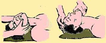 При запрокидывании вследствие натяжения тканей корень языка отходит от задней стенки глотки, рот открывается. Если он не открывается, надавливают на подбородок пострадавшего. Чтобы убедиться в восстановлении проходимости дыхательных путей, в них вдувают воздух по одному из описанных ниже методов ИВЛ. Если грудная клетка не расширяется, необходимо дополнительно выдвинуть вперед нижнюю челюсть, используя так называемый тройной прием (рис. 5) при котором голова пострадавшего охватывается двумя ладонями и запрокидывается назад. При этом вторым и пятым пальцами, размещенными под углами нижней челюсти, выдвигает ее вперед, а первыми пальцами, упираясь в подбородок, открывают рот. Менее удобно выдвижение нижней челюсти одной рукой.