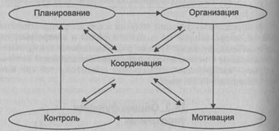 Ряд авторов [50, 79, 126] выделяют пять функций: планирование, организацию (или организовывание), координацию, контроль и мотивацию. Взаимосвязь между ними может быть представлена круговой диаграммой, изображающей содержание любого процесса управления (рис. 5.40). Стрелки на диаграмме показывают, что движение от стадии планирования к контролю возможно лишь путем выполнения работ, связанных с организовыванием процесса и с мотивированием работающих. В центре диаграммы находится функция координации, обеспечивающая согласование и взаимодействие всех остальных функций. Однако, по нашему мнению, каждая функция представляет собой деятельность по координации, которую практически невозможно обособить в ограниченном количестве подразделений.