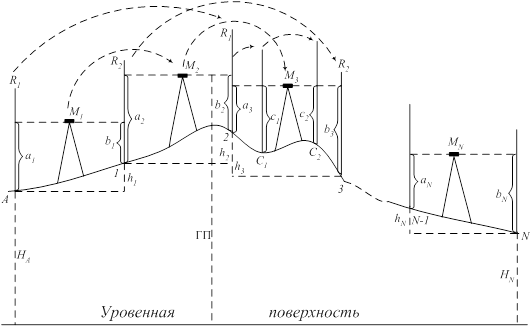 Нивелирование начинается со станции М1, где берут отсчет по задней рейке а1 и отсчет b1 по передней рейке. В результате получают отсчет h1. Затем заднюю рейку R1 из начальной точки А переносят в точку 2, рейку R2 оставляют в точке 1, а нивелир устанавливают на второй станции М2, с которой берут отсчеты по рейкам a2, b2. В том же порядке продолжают нивелирование со следующих станций вплоть до конечной точки В (на рис. 7.2 стрелками указан порядок переноса нивелира и реек с одной точки на другую). Отметим, что точка 1 при нивелировании со станции М1 является передней, а при нивелировании со станции М2 – задней. Также точка 2 при нивелировании со станции М2 является передней, а со станции М3 – задней. Точки, общие для двух смежных станций, называются связующими.