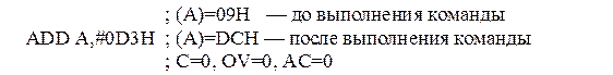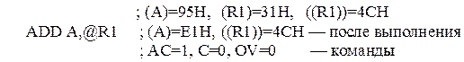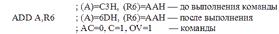 Эта команда (сложение) складывает содержимое аккумулятора А с содержимым байта-источника, оставляя результат в аккумуляторе. Для команды сложения разрешены следующие способы адресации байта-источника: