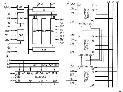 Упрощенная структурная схема ПКП приведена на рис. 3.9, а. В состав БИС входят: двунаправленный 8-разрядный буфер данных (BD), предназначенный для сопряжения ПКП с системной информационной шиной; блок управления записью-чтением: (RWCIJ), принимающий управляющие сигналы от МП и задающий режим функционирования ПКП; схема каскадного буфера-компаратора (СМР), используемая для включения в систему нескольких ПКП; схема управления (СU), вырабатывающая сигнал прерывания и формирующая трехбайтную команду CALL для выдачи на шину данных; регистр запросов прерываний (RGI), используемый для хранения всех уровней прерываний, на которые поступают запросы; схема принятия решений по приоритетам (PRB), идентифицирующая приоритеты запросов и выбирающая запрос с наивысшим приоритетом; регистр обслуживаемых прерываний (ISR), сохраняющий уровни запросов прерываний, находящихся на обслуживании ПКП; регистр маскирования прерываний (RGM), обеспечивающий запрещение одной или не