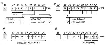 Установка ПКП в исходное состояние и настройка его на определенный режим обслуживания прерываний программируется двумя типами команд: командами инициализации (ICW) и командами управления операциями (OCW). Для инициализации в ПКП последовательно вводятся команды ICWI и ICW2. В микропроцессорной системе, состоящей из нескольких ПКП, для каждого из них после двух первых команд инициализации вводится команда ICW3, задающая режим взаимодействия контроллеров. Форматы команд инициализации приведены на рис. 3.10.