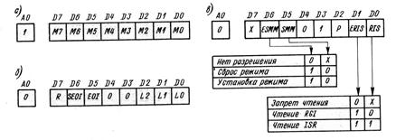 Команда управления операциями OCWI (рис. 3.11, а) устанавливает или сбрасывает разряды регистра RGM. Установка некоторого разряда регистра маскирования приводит к запрету прерывания по соответствующему входу.