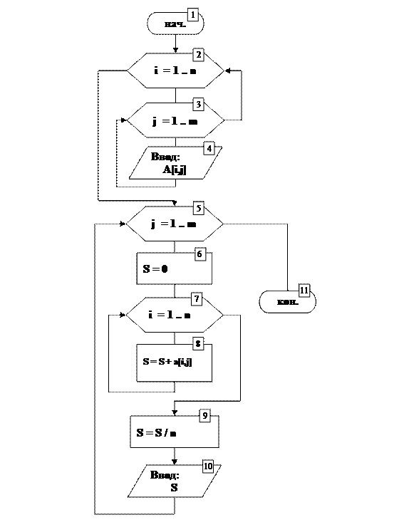 Далее, в обрабатывающей части алгоритма, внешний цикл (блок 5) задаёт значение счётчика j, который определяет номер обрабатываемой строки. Внутри данного цикла находится алгоритм вычисления суммы элементов одномерного массива (блоки 6, 7, 8). После этого значение переменной S, в которой сохранено значение суммы элементов строки, будет поделено на количество столбцов массива (блок 9) и полученное среднеарифметическое будет выведено на экран (блок 10).