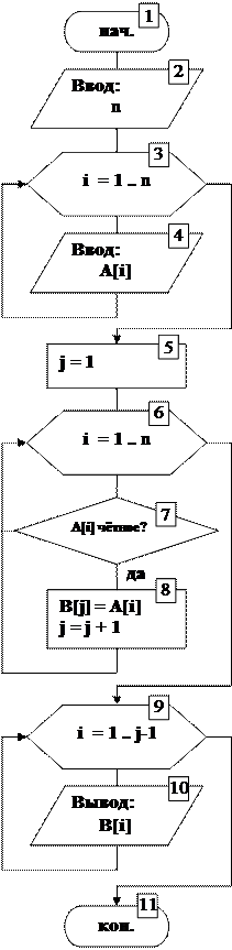 Для индексов найденных элементов используется независимый счётчик j. В начале перебора ему присваивается значение 1 (блок 5). При нахождении в исходном массиве первого чётного элемента выполняется его запись в массив В под номером j (j = 1), и значение счётчика j увеличивается на единицу и становится равным 2 (блоки 7, 8). Соответственно, следующий найденный элемент будет помещён в массив В под номером 2.