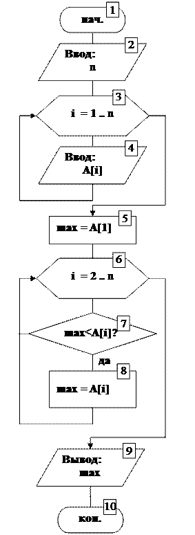 Затем организуется перебор элементов массива, начиная со второго (блок 6). В теле цикла текущий максимальный элемент сравнивается с очередным элементом массива, и большее из этих значений сохраняется в качестве нового текущего максимального в переменной max (блоки 7, 8). Таким образом, при первом проходе цикла выбирается максимальное значение из двух первых элементов. На втором проходе полученное значение сравнивается с третьим элементом, и т. д. После окончания цикла в переменной max будет находиться максимальное из всех значений элементов массива.