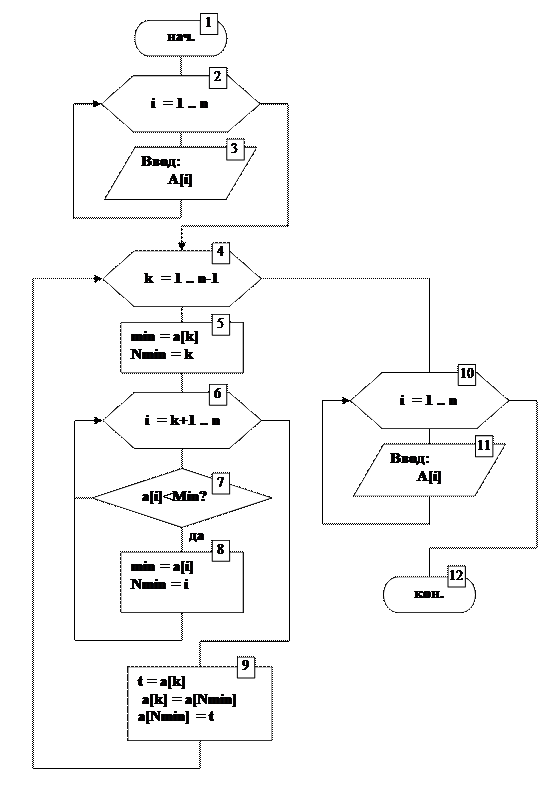 Тело основного цикла (блоки 5, 6, 7, 8) содержит алгоритм поиска минимального элемента. Его отличает от алгоритма, представленного на рисунке 19, следующее: осуществляется поиск не максимального, а минимального элемента (поскольку сортировка производится по возрастанию элементов), поиск осуществляется не по всему массиву, а только в его части (элементы с индексами от k+1 до n), помимо самого минимального значения выясняется и его положение в массиве (переменная Nmin). Далее в блоке 9 происходит перестановка элементов массива, так что найденный минимальный элемент оказывается на вершине необработанной части массива, под индексом k.