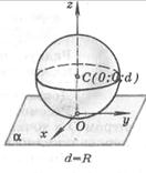 2) d = R. Если расстояние от центра сферы d до плоскости равно радиусу сферы R, то сфера и плоскость имеют только одну общую точку.