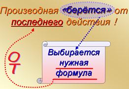 Учитель. При изучении темы «Производная и её применение» мы, прежде всего, учились находить производную, используя правила дифференцирования и таблицу производных. Обобщая свои действия по нахождению производной, мы вывели общее правило: «Производная «берётся» от последнего действия».