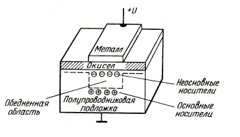 Основу ПЗС составляют конденсаторы МОП структуры(рис. 3.7) одной из обкладок, которого служит металлический электрод, второй – полупроводниковая подложка, диэлектриком служит слой двуокиси кремния толщиной 0.01 мм. В полупроводнике дырочного типа основными носителями являются дырки, поэтому если приложить к металл электроду положительный потенциал, то дырки будут отталкиваться в глубь полупроводника и под электродами образуется область обедненная носителями – потенциальная яма, глубина которой зависит от напряжения на затворе, степени легирования полупроводника и толщины окисла. Т.о. изменяя U затвора можно эффективно управлять глубиной потенциальной ямы, однако, время жизни потенциальной ямы ограничено паразитным процессом термогенерации не основных носителей заряда (ННЗ), т.к. в кремнии всегда генерируются пары электрон-дырка. Под действием электрического поля основные носители зарядов (ОНЗ) «отгоняются» в толщину, а ННЗ постепенно заполняют яму. Это паразитный процесс, а время заполнения ямы называется временем релаксации.