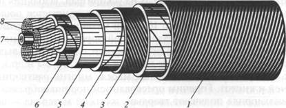1,4 — покровная и внутренняя оболочки; 2 — броня; 3 — подушка; 5— поясная бумажная изоляция; 6— жильная изоляция; 7— нулевая жила; 8 — токопроводящая жила.