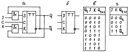 На рисунке 62 изображён универсальный – JК-триггер (от англ. jump – скачок, kеер – держать). Триггер имеет два информационных входа J и К, и тактируемый вход С.