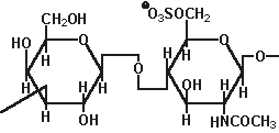 | Гепарин и гепаран сульфаты: состоят из D-глюкуронат -2-сульфата (или идуронат-2-сульфата) + N-сульфо-D-глюкозамин-6-сульфата Связь (1, 4) (гепараны менее сульфированы чем гепарины) |