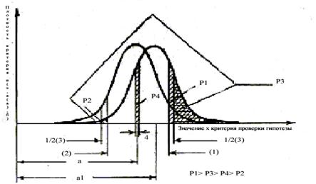 Вопрос в том, какую из этих критических областей следует выбрать. Предположим, что с проверяемой гипотезой H0 конкурирует другая, альтернативная, гипотеза H1, при которой распределение статистики критерия Θn нормально – N(a1,s2). Причем а1 > a0. Если α зафиксировано и равно 0,05, очевидно, нужно выбрать ту критическую область, которой соответствует наибольшая мощность критерия 1–b, т.е. наибольшая вероятность того, что неверная (альтернативная) гипотеза будет отвергнута. Предположим мы выбрали критическую область 1, тогда, если Θn > Θкр1, гипотеза H0 принимается. Но в этом случае может быть верна конкурирующая гипотеза H1 с вероятностью ошибки второго рода b. При этом b на чертеже (рис. 3) интерпретируется как площадь под кривой 2 левее Θкр1, а мощность критерия 1-b – площадью Р1 правее Θкр1. Аналогично, Р2, Р3, Р4 соответствуют мощностям критерия при критических областях 2, 3, 4-го типов. Из графиков видно, что целесообразно выбрать критическую область 1, так как Р1 имеет наибольшее значение по сравнению с Р2, Р3, Р4 – при сдвиге кривой 1 вправо, она единственная из всех площадей увеличилась.