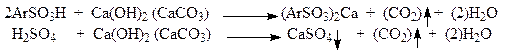 При нейтрализации сульфомассы известью не образуется углекислый газ, что существенно облегчает ведение процесса на данной стадии, но мел является более дешевым сырьем, и при его использовании образуется более легко фильтрующейся гипс (дигидрат СаSO4´2Н2О). Раствор, полученный после фильтрации и промывки гипса, упаривают и осаждают аренсульфонат кальция.