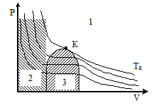 Критическая точка К соответствует такому набору параметров Тк, Рк, nmк, для которого исчезает различие между жидким и газообразным агрегатным состояниями вещества. Из уравнения Ван-дер-Ваальса: