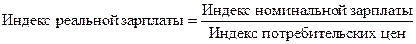 Реальная заработная плата - это количество товаров и услуг, которые можно приобрести на номинальную зарплату. Реальная зарплата зависит, во-первых, от уровня номинальной зарплаты и, во-вторых, от уровня цен на товары и услуги. Показателем, позволяющим определить изменение реальной заработной платы за тот или иной период времени, является индекс реальной заработной платы. Индекс - это относительная (выраженная в процентах) величина, количественно характеризующая изменение данного процесса по сравнению с определенным периодом времени, который принимается за базовый. Например, если индекс цен по сравнению с предыдущим годом составил 120 %, то это означает, что уровень цен за год вырос на 20 %. Индекс реальной заработной платы рассчитывается как отношение индекса номинальной заработной платы к индексу потребительских цен