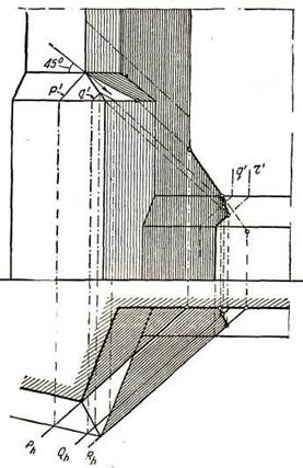 Тень кронштейна карниза на фасаде (рис. 43) построена при помощи бокового вида; построение показано на самой фигуре.