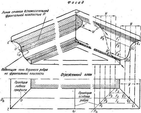 Следует иметь в виду, что при сложных тягах карниза приходится часто брать на профильной проекции карниза проекции обратных лучей для того, чтобы найти точки перелома тени на фасаде.