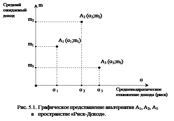 Для более глубокого понимания проблемы сравнения альтернатив в условиях риска удобно представить множество анализируемых альтернатив как набор точек в двухмерном декартовом пространстве. При этом каждой альтернативе с известными ее параметрами математическим ожиданием дохода (m) и среднеквадратическим отклонением дохода (σ) соответствует точка с координатами (σ;m) в указанном пространстве (далее пространство «Риск-Доход»), причем среднеквадратическое отклонение дохода (σ) откладывается по оси абсцисс, а математическое ожидание дохода (m) – по оси ординат.