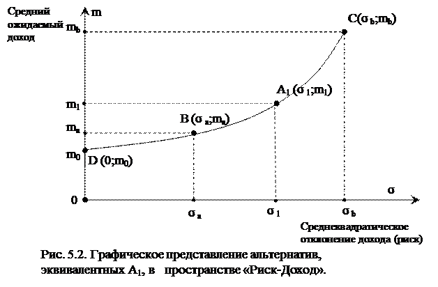 Очевидно также, что все точки, лежащие на прямой m = m0 (рис. 5.3) будут заведомо менее предпочтительны, чем безрисковый эквивалент точки A1, представленный точкой D (0;m0), поскольку будет иметь место ненулевой риск при сохранении среднего ожидаемого дохода на прежнем уровне. Для того, чтобы достичь безрискового эквивалента, для каждой точки прямой m = m0 необходимо такое увеличение среднего ожидаемого дохода альтернативы, которое бы компенсировало принимаемый риск. В частности, применительно к точке A1* (σ1;m0) для этого потребуется увеличение среднего ожидаемого дохода на величину m1 – m0.